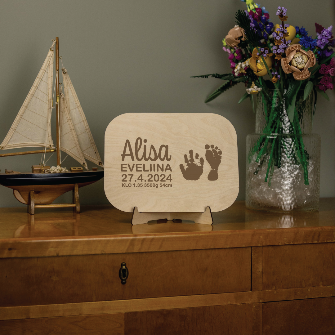 Uniikit koivuvanerista valmistetut syntymätaulut kertovat lapsen syntymän tärkeät tiedot kauniisti kaiverrettuna. Tyylikäs...