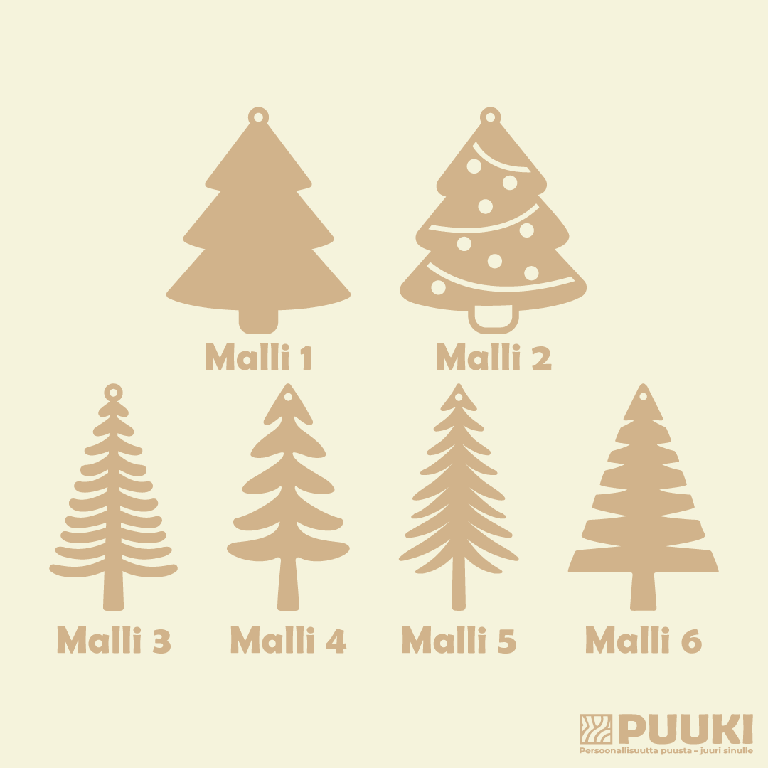 Joulukuusi (eri malleja) -kuusenkoriste, joka on valmistettu korkealaatuisesta kotimaisesta koivuvanerista. Se on käsitelty ekologisella ja elintarviketurvallisella pinnoitteella, joka tekee pinnasta likaa ja vettä hylkivän. Tuote on kooltaan noin 9cm korkea