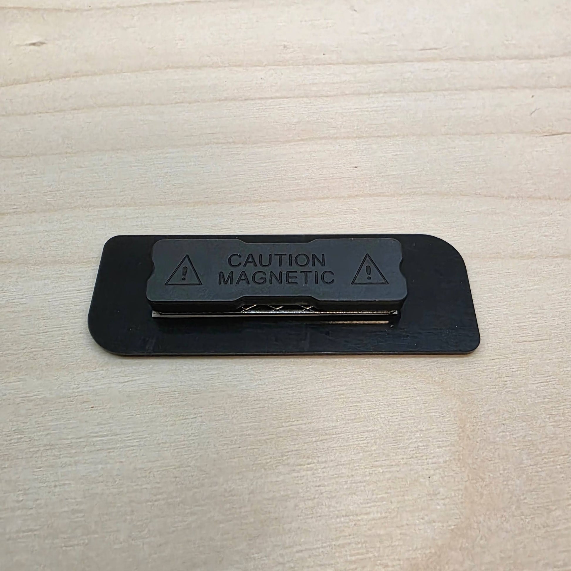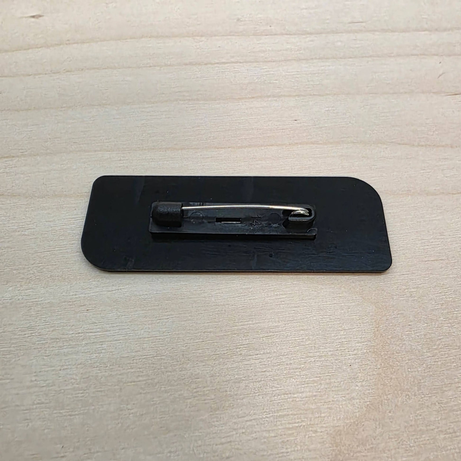 Saatavilla useita väriyhdistelmiä (esim. musta/valkoinen, valkoinen/musta, kultainen/musta) sekä kaksi kiinnitysvaihtoehtoa: magneetti (+2 €) ja neulakiinnitys.