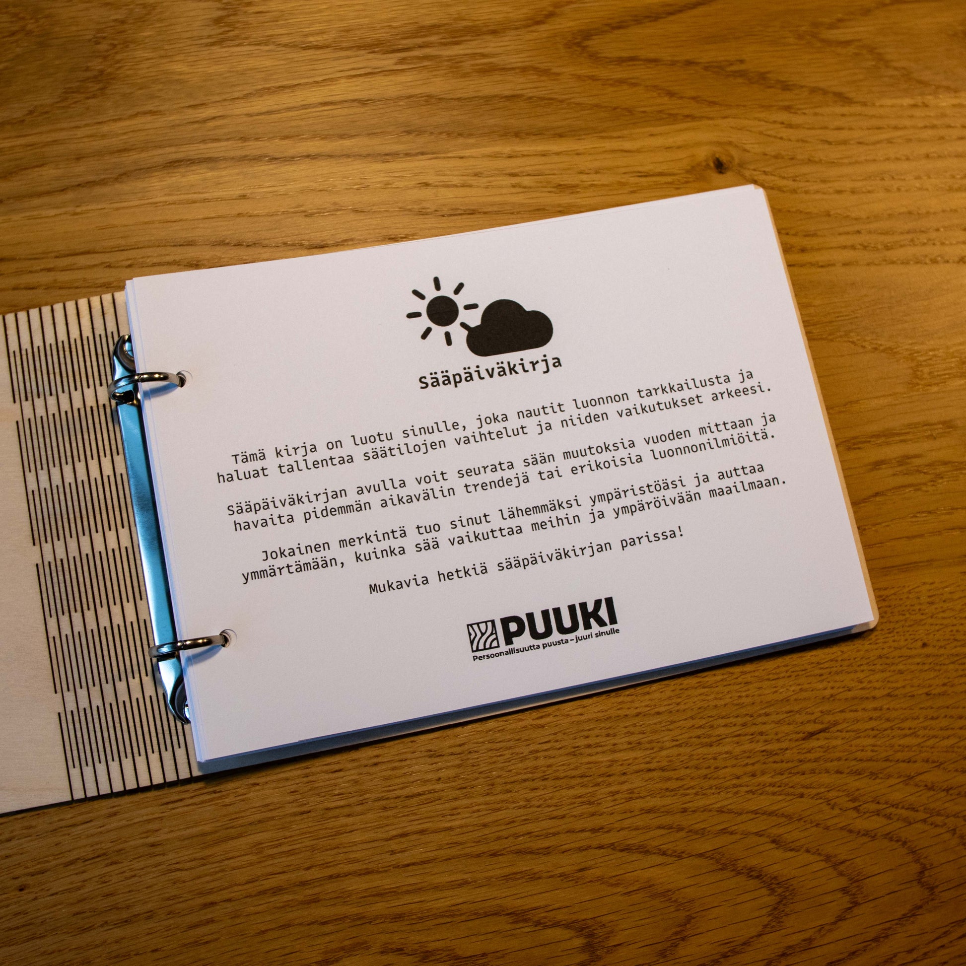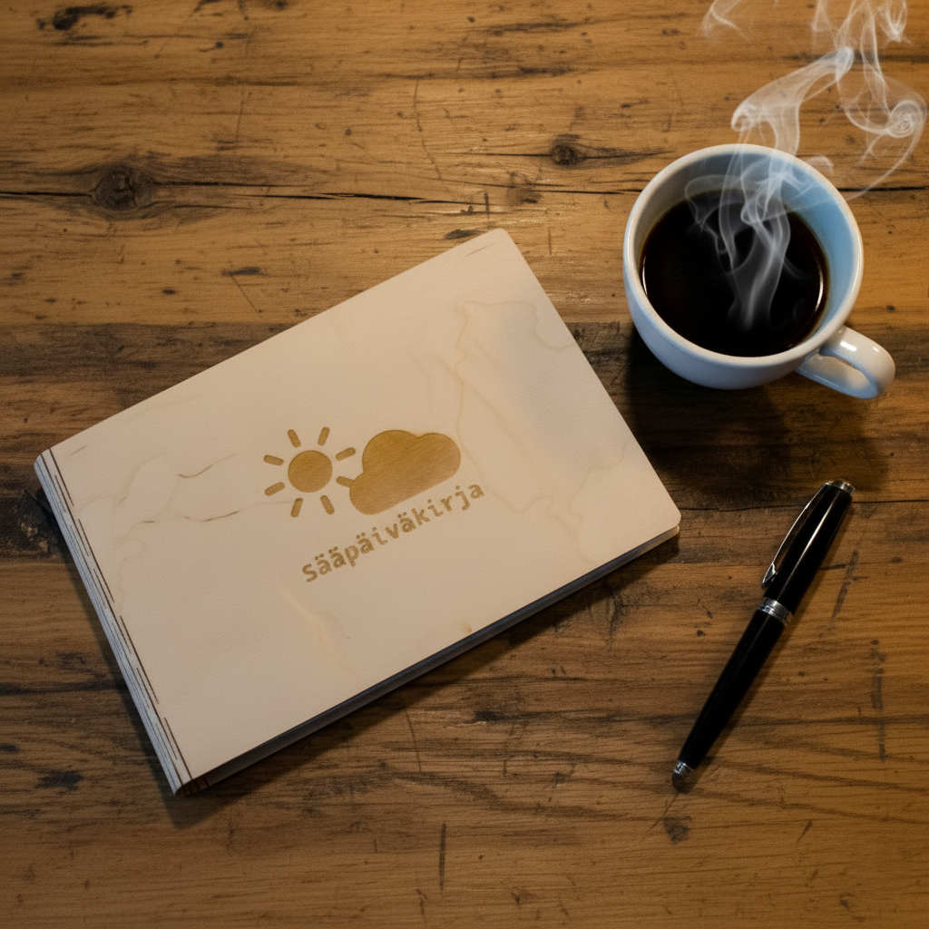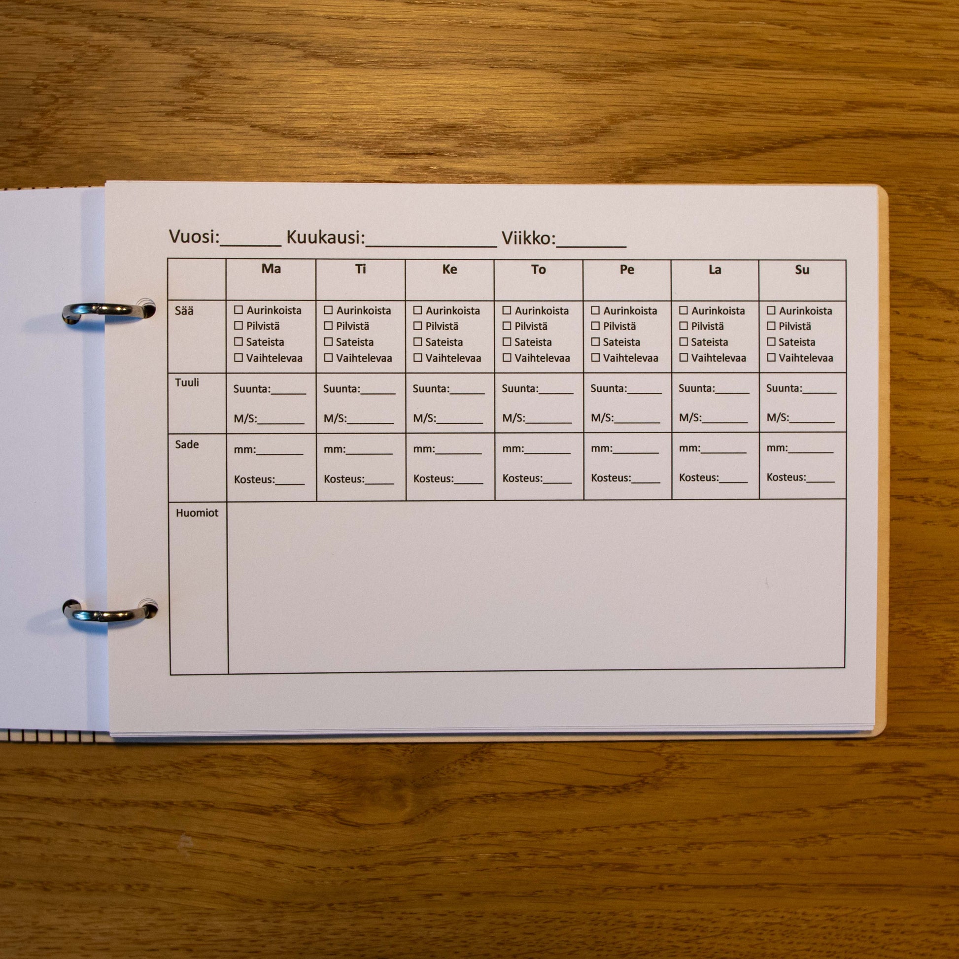 - Sisältö: Yhdellä sivulla viikon säähavainnot (lämpötila, sade, tuuli ym.) sekä omat muistiinpanot ja fiilikset.