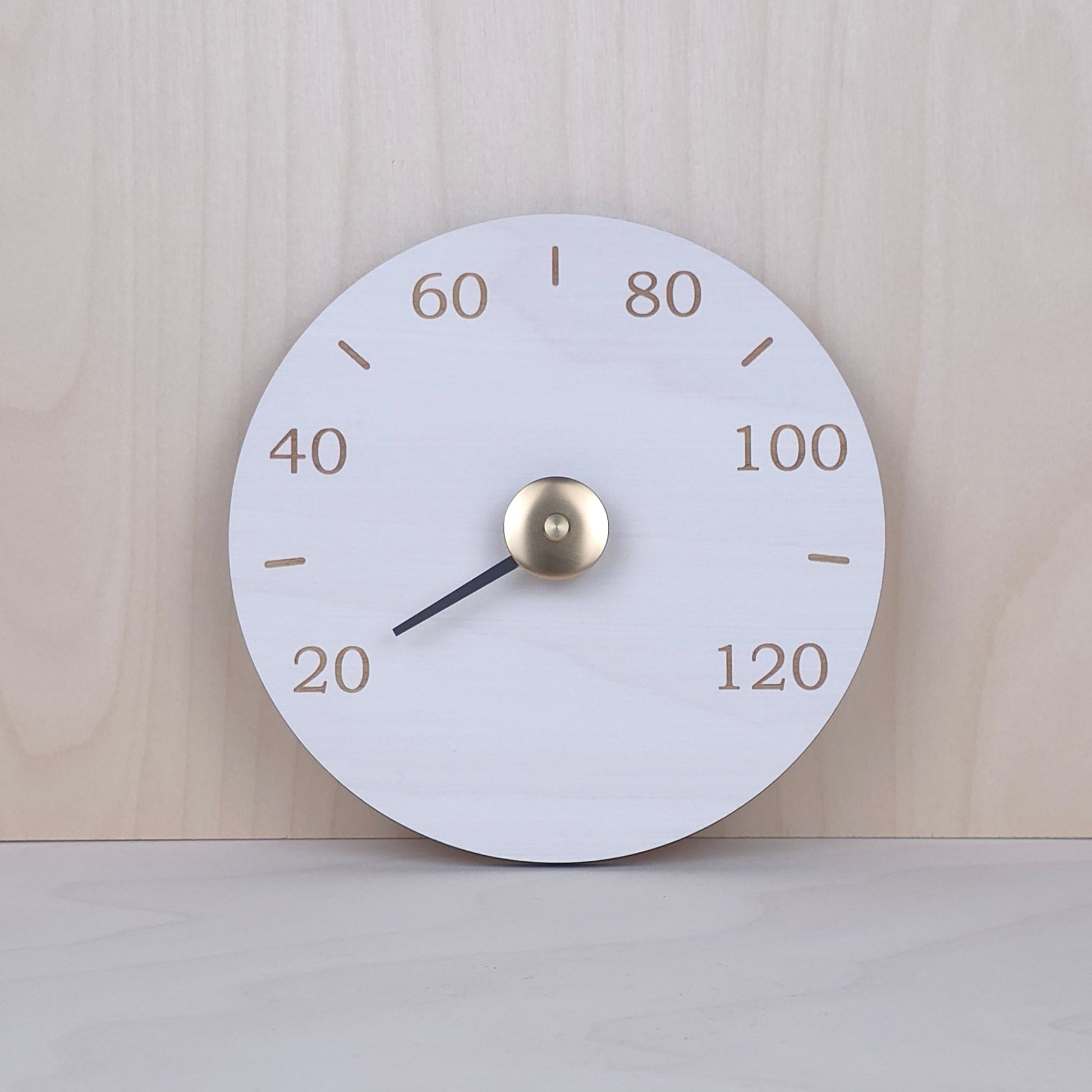 saunan lämpömittari, puinen lämpömittari, koivuvaneri lämpömittari, valkoinen saunan lämpömittari, sauna sisustus, saunatarvikkeet, kotimainen saunamittari, laadukas saunan lämpömittari, design lämpömittari sauna